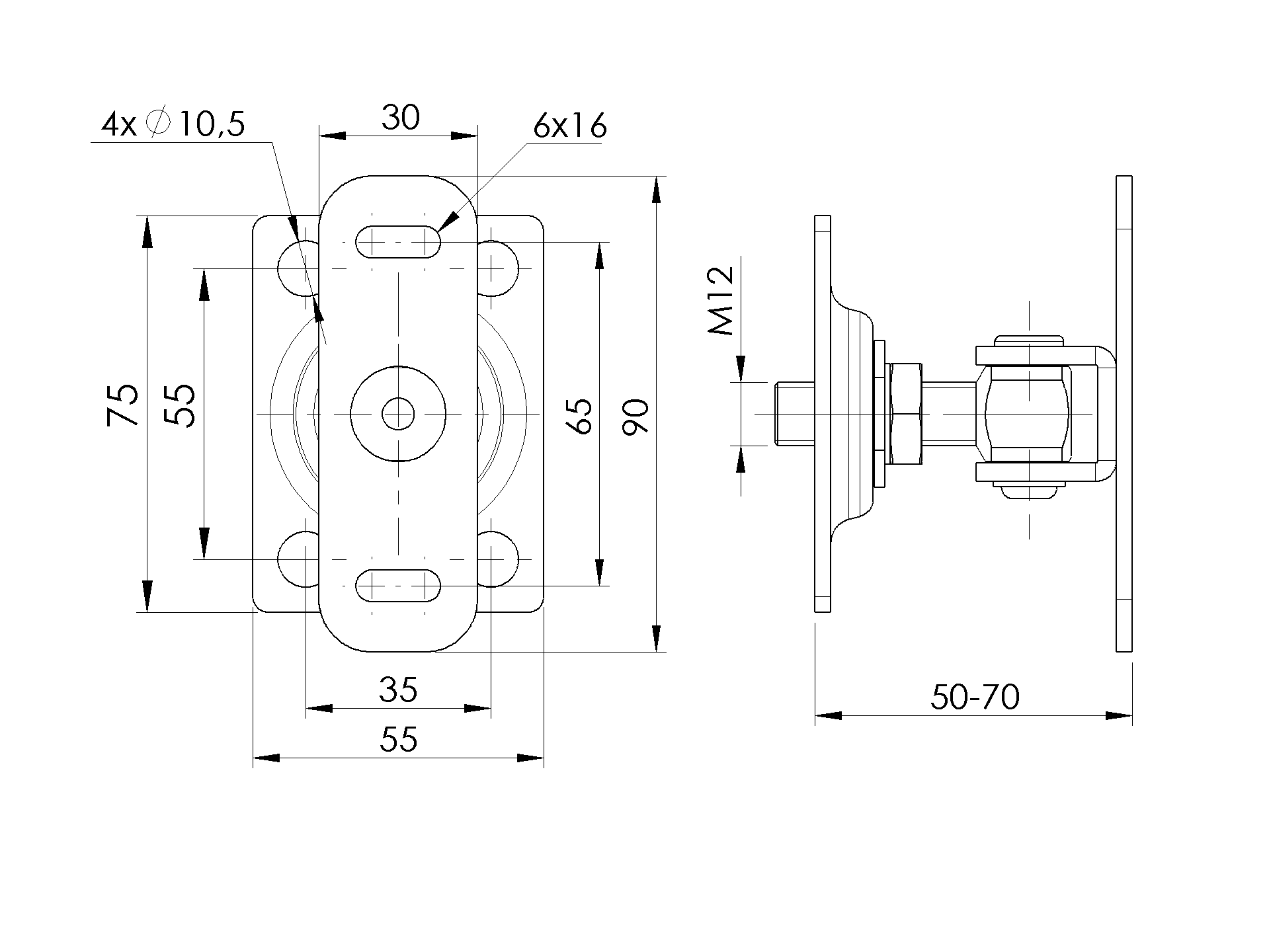 - Zawias posiada płytkę montażową 55×75 mm ułatwiającą montaż – wystarczy przykręcić zawias do słupka;
