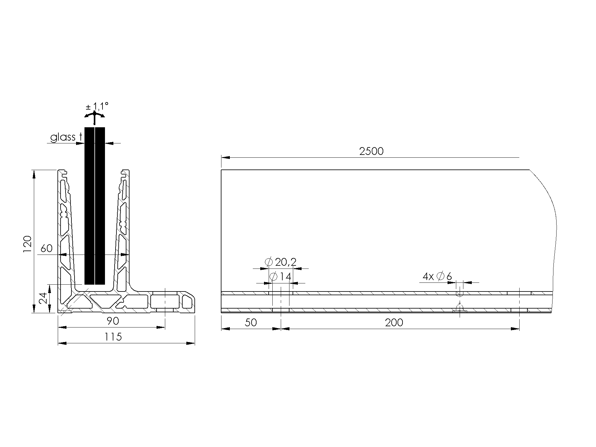 PROFIL ALUMINIOWY DO BALUSTRADY SZKLANEJ Z PRZECHYLENIEM SZKŁA SZKŁO: 12 – 17.52 – ALUMINIUM