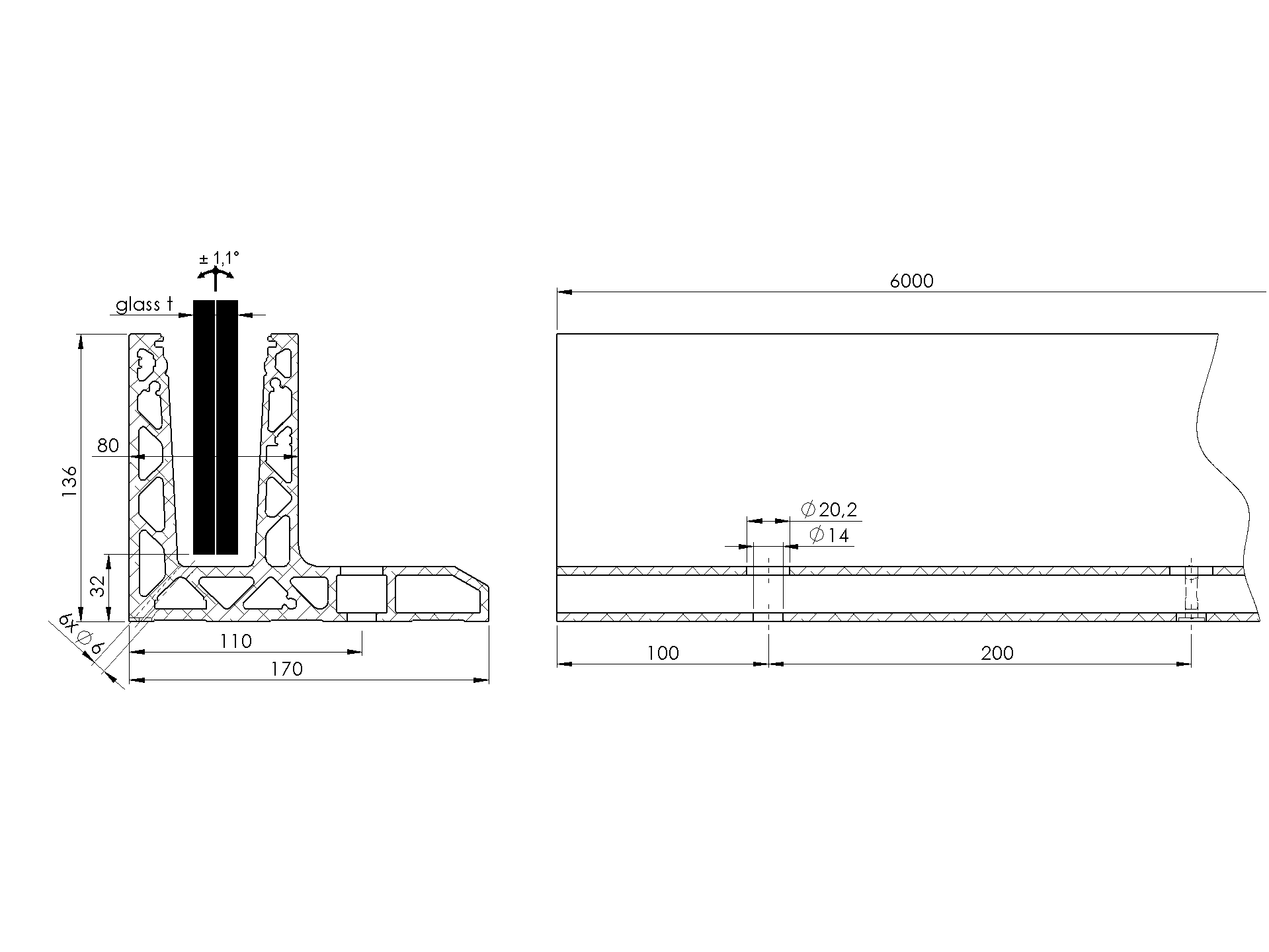 PROFIL ALUMINIOWY DO BALUSTRADY SZKLANEJ Z PRZECHYLENIEM SZKŁA SZKŁO: 16.76 – 21.52 / 24.76 – 31.52 – ALUMINIUM