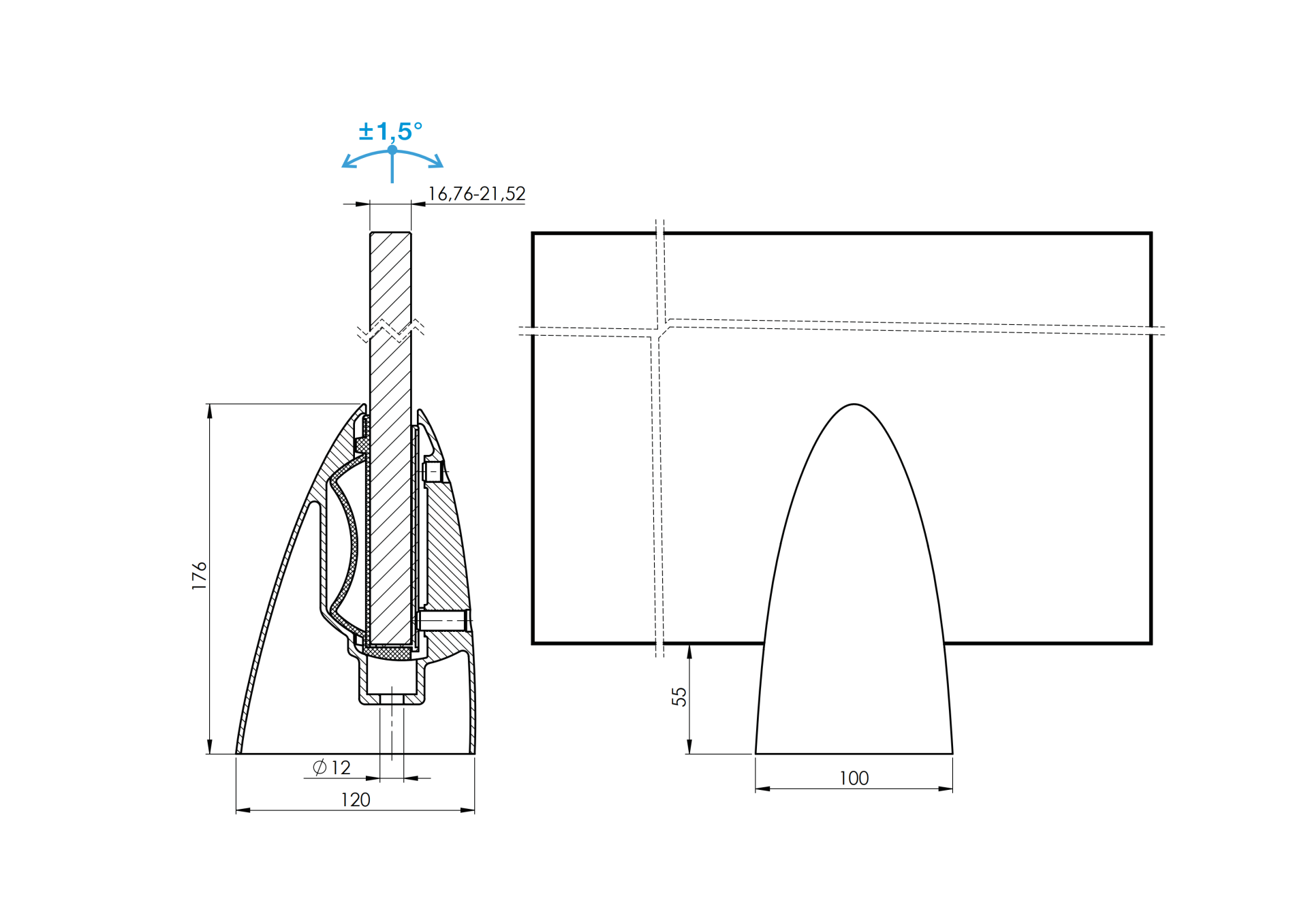 • Spigot daje nam możliwość regulacji kąta pochylenia szyby ± 1.5°;