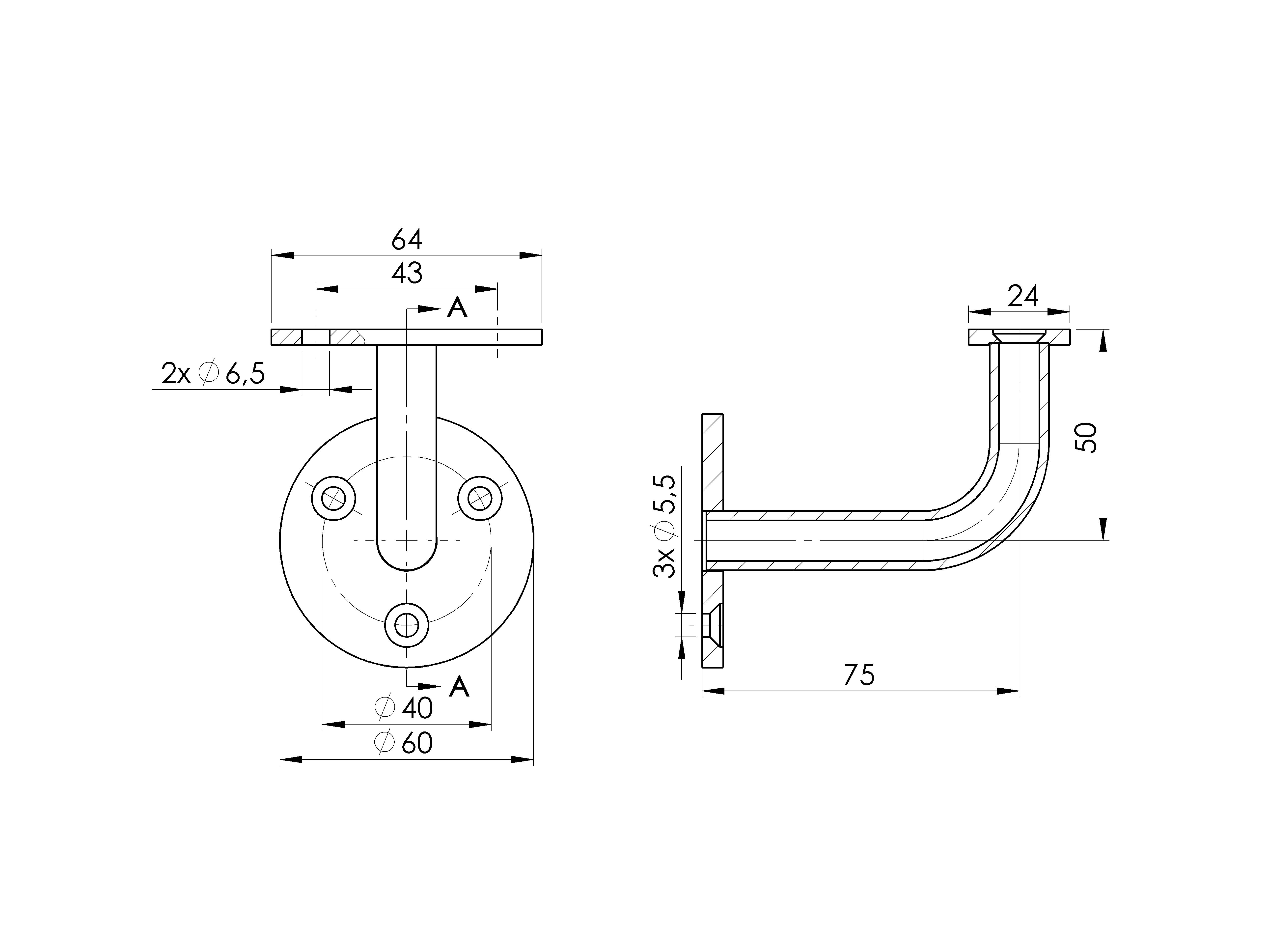 UCHWYT PORĘCZY ŚCIENNEJ 75-50 GWINT M6 SATYNA PRZYŁĄCZ PŁASKI OTWÓR LED AISI 316
