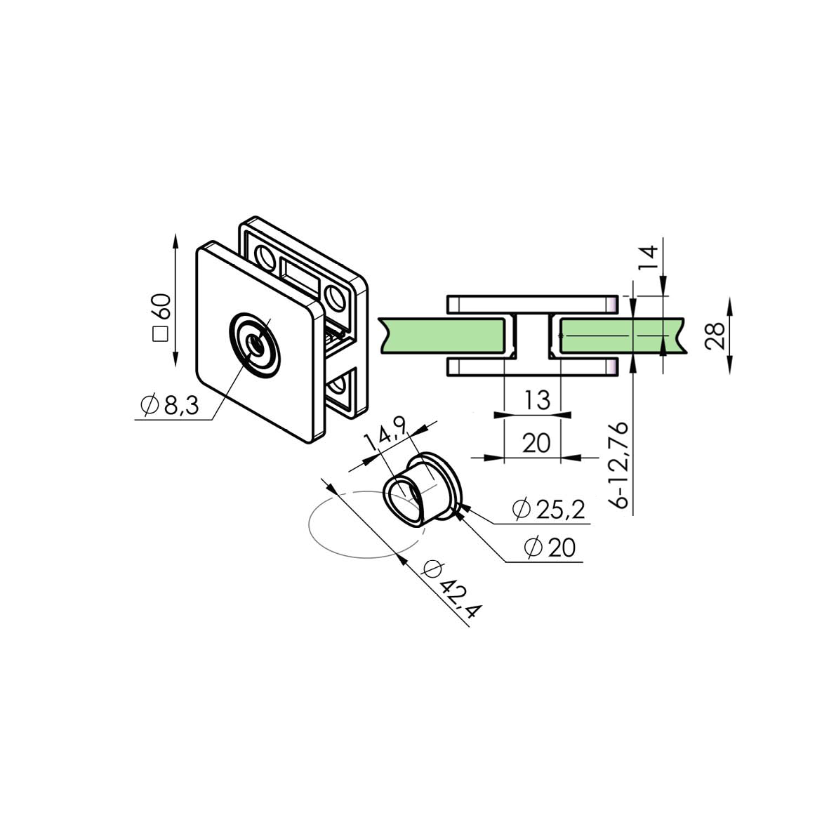 - Kwadratowy kształt uchwytu zapewnia stabilność i mocne trzymanie paneli szklanych, a jego uniwersalne wymiary umożliwiają zastosowanie w różnych konstrukcjach.