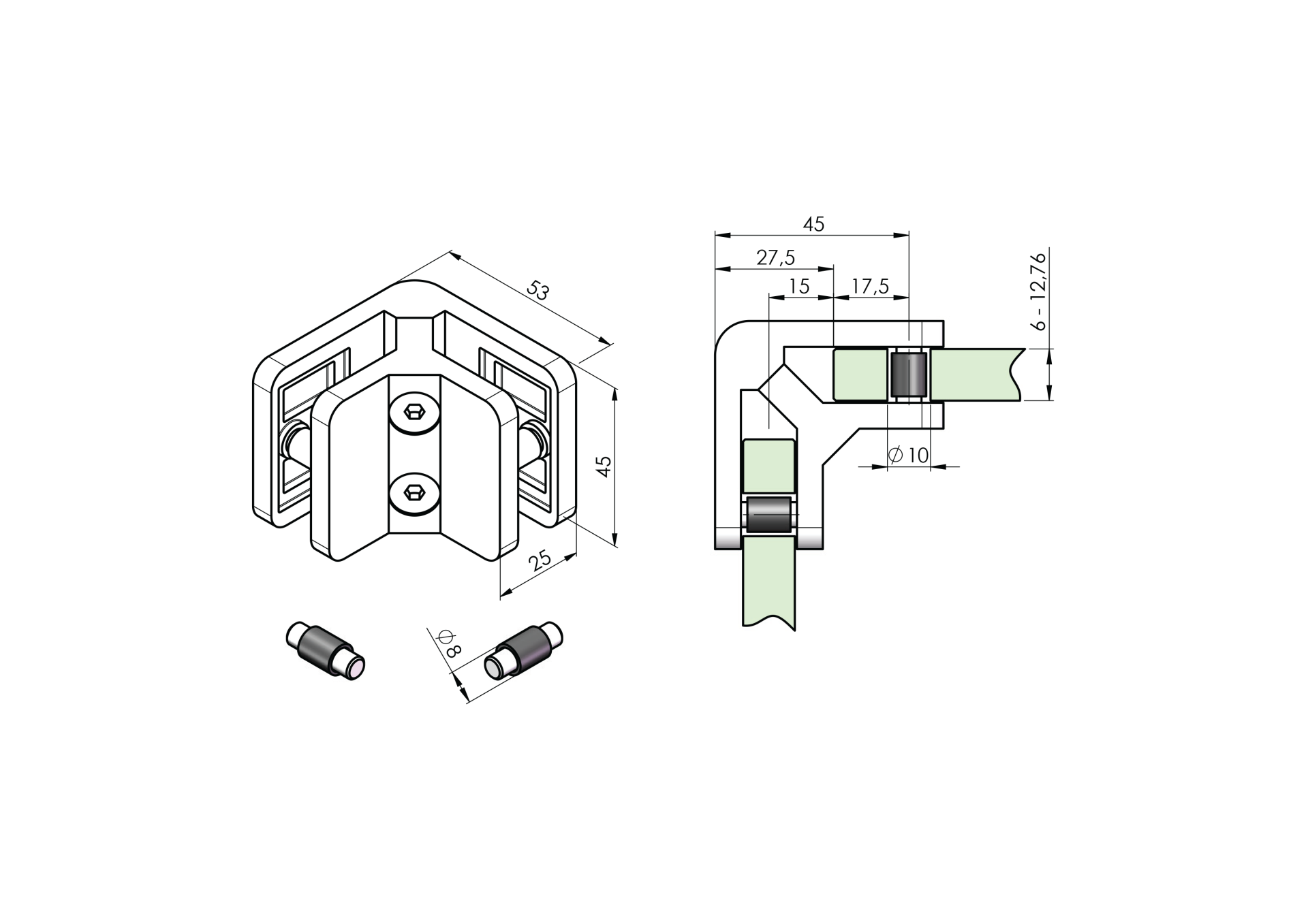 UCHWYT SZKŁA ŁĄCZNIK NAROŻNY 45X45 PRZYŁĄCZ PŁASKI SATYNA DLA SZKŁA 6-10.76 Z BLOKADĄ