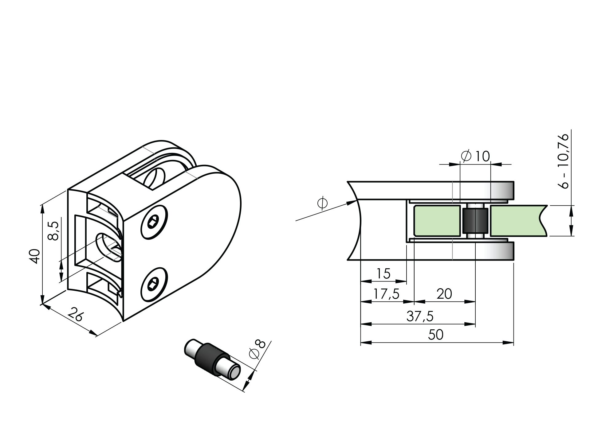 W zestawie nie ma gumek Materiał: Stal nierdzewna kwasoodporna AISI 316, Wykończenie powierzchni: POLER , Element do balustrady szklanej Dla szkła: 6mm – 10,76mm Do słupka okrągłego