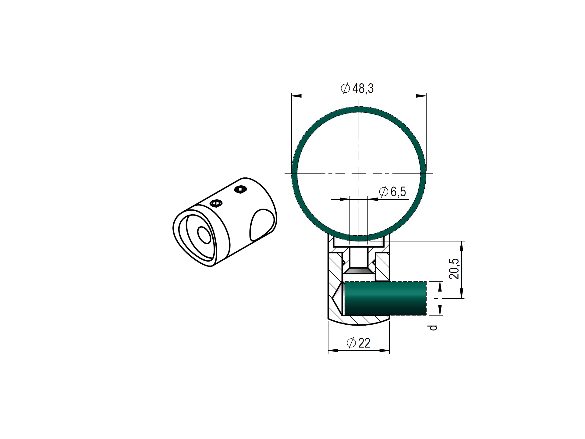 UCHWYT WYPEŁNIEŃ KOŃCOWY PRAWY PRZYŁĄCZ FI 48 WYPEŁNIENIE FI 12 – STAL KWASOODPORNA AISI 316