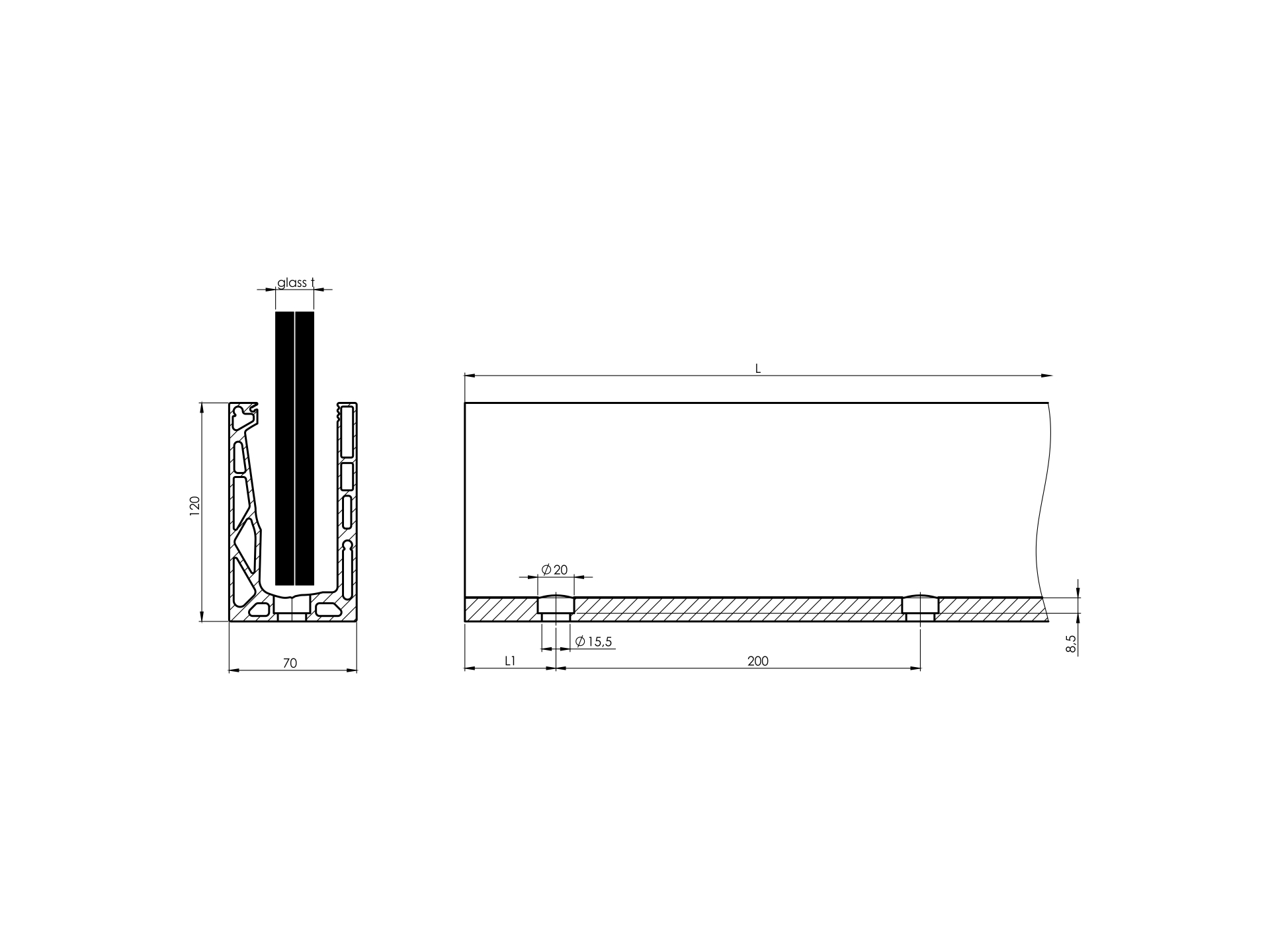Materiał: Aluminium, Wykończenie powierzchni: Satin-ELOX, szkło t: 12,00-21,52, L: 6000, Efekt: ELOX, Mocowanie: Z wierzchu, G/h kN: 1, L1: 100, L2: 200, Dlugosc: 6 m