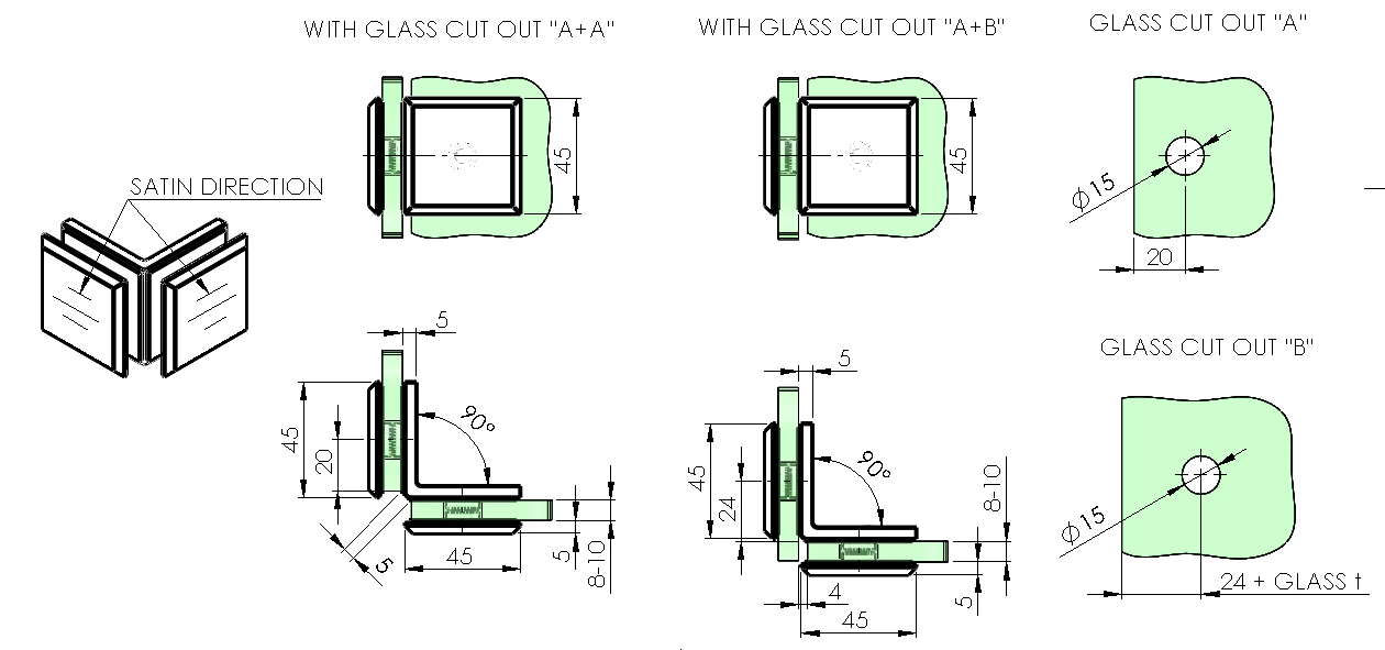 UCHWYT SZKŁA NAROŻNY 90 STOPNI SZKŁO – SZKŁO T: 8 – 10 – ZAMAK SATYNA