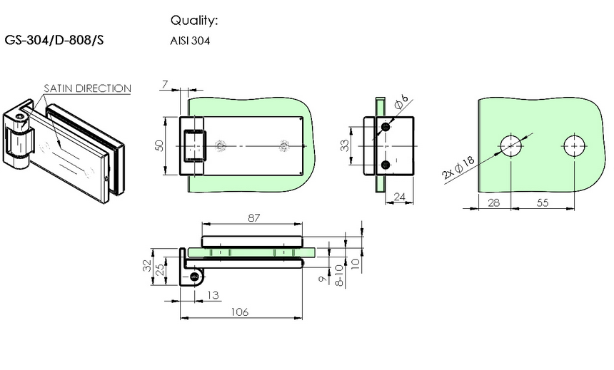 ZAWIAS DO OŚCIERZNICY DRZWI SZKLANYCH DLA SZKŁA 8-10 – ALUMINIUM / STAL NIERDZEWNA AISI 304 SATYNA
